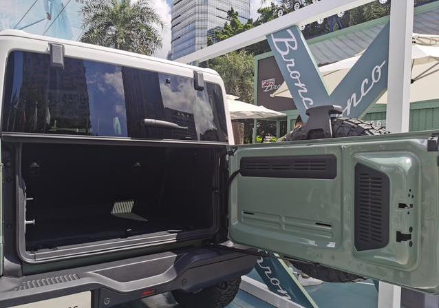 再说后门设计,背书包式,分上下两段平开,方便又实用。这设计是为了配合可拆卸车顶,打开后门,车内空间直接放大,装装备、放行李都方便。国内车企要造这种车,得多琢磨怎么把实用性和酷炫结合。