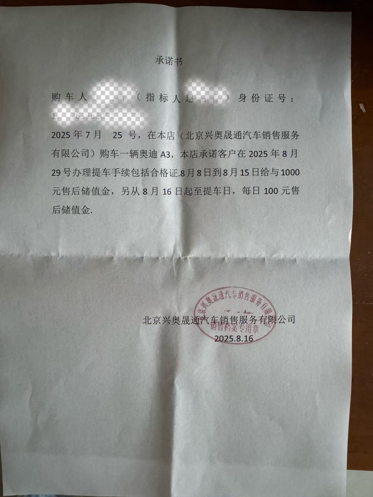 车主赵女士介绍,她今年7月25日购买了一辆奥迪A3并开具发票,兴奥晟通公司与她约定8月8日交车,推迟至8月15日,被店方告知仍然不能提车。兴奥晟通公司8月16日向她出具承诺书,提到8月29日交付车辆、合格证以及给予相应售后储值金,但截至目前仍未兑现。