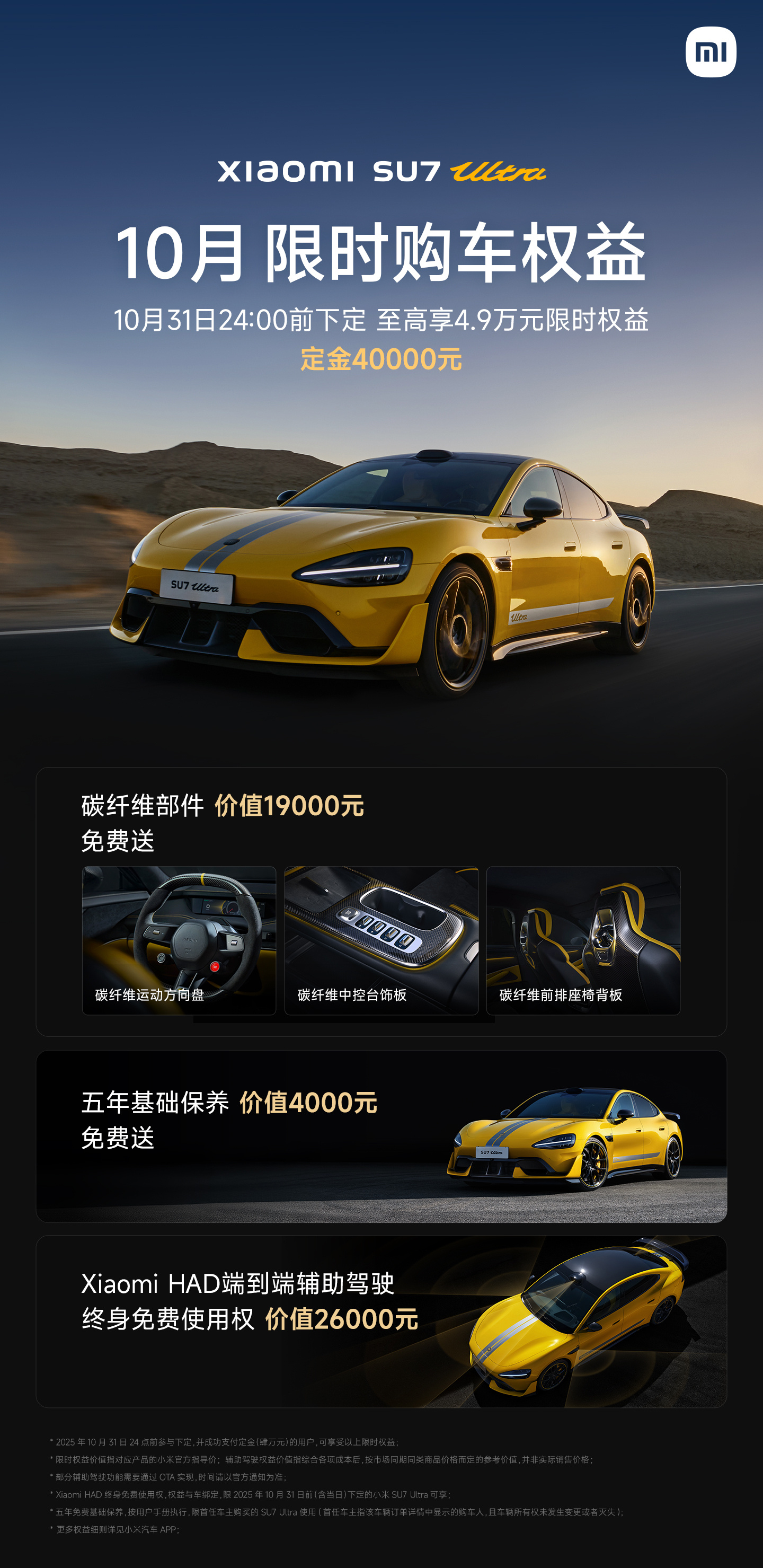IT之家 10 月 1 日消息,小米汽车 10 月限时购车权益现已发布,其中 YU7、SU7、SU7 Ultra 的权益均包含辅助驾驶终身免费使用权。