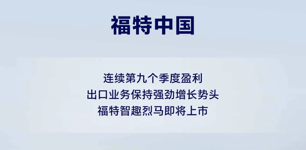 不过,福特却通过对战略、渠道等一系列的调整,实现了教科书级的扭亏为盈。官方公告显示,第三季度福特营收505亿美元,创下历史新高,全年业绩指引更新;同时福特中国更是连续九个季度盈利,出口业务保持强劲增长势头,福特智趣烈马也即将上市。
