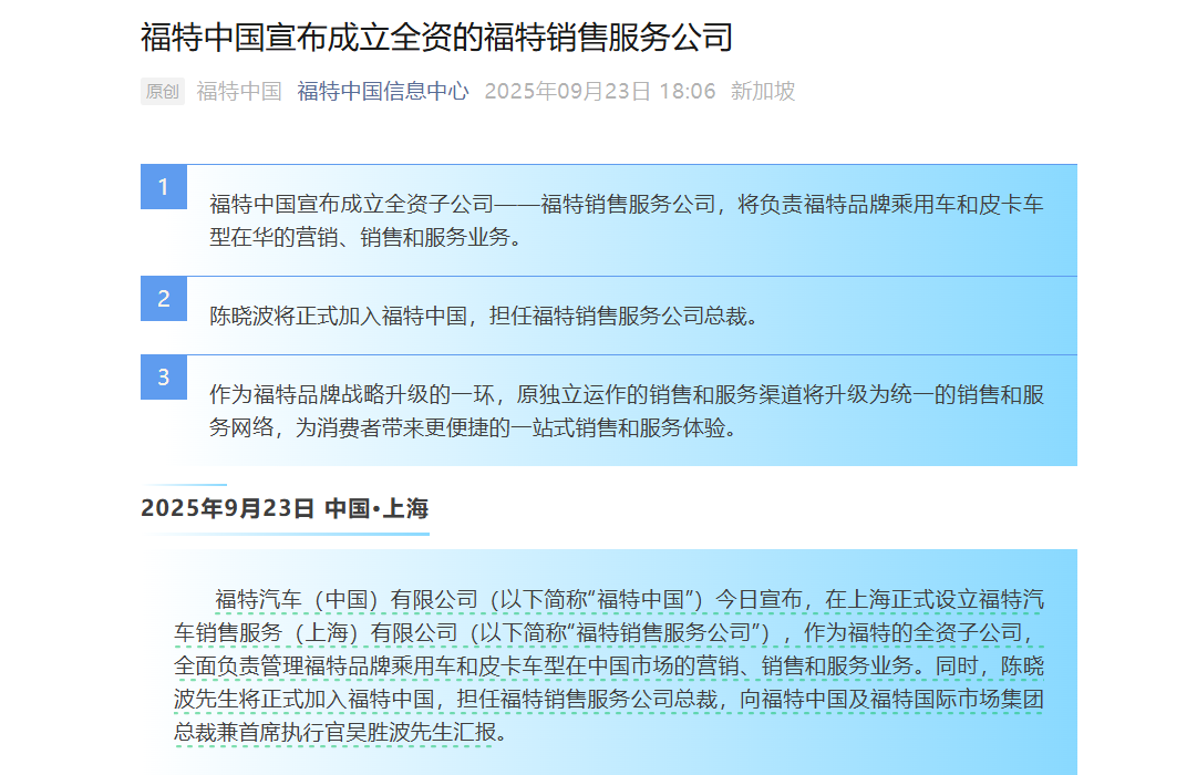 因此,长安福特、江铃福特“整合渠道、一体协同”的战略调整也是顺理成章。9月23日,福特中国宣布成立全资子公司——福特销售服务公司,负责福特品牌乘用车和皮卡车型在华的营销、销售和服务业务,且原独立运作的销售和服务渠道将升级为“统一的销售和服务网络”,未来长安福特、江铃福特将会放到同一门店里进行销售、维保。这一举措不仅能将品牌形象进行统一,消费者也将得到更便捷、更省心的售前和售后服务体验。