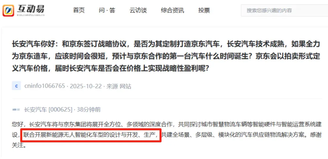 关于这个问题,长安汽车很快做出回应:您好,长安汽车将与京东集团展开全方位、多领域的深度合作,共同探讨城市智慧物流车辆等智能硬件与智能运营系统建设,联合开展新能源无人智能化车型的设计与开发、生产、全场景、多层级、模块化的汽车供应链物流解决方案。