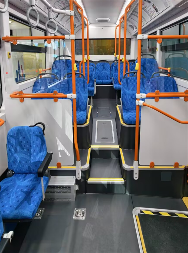 车内采用抑菌座椅、扶手不落地设计,后轮包通道宽度达590mm,提升乘客通行便利性和清洁效率。
