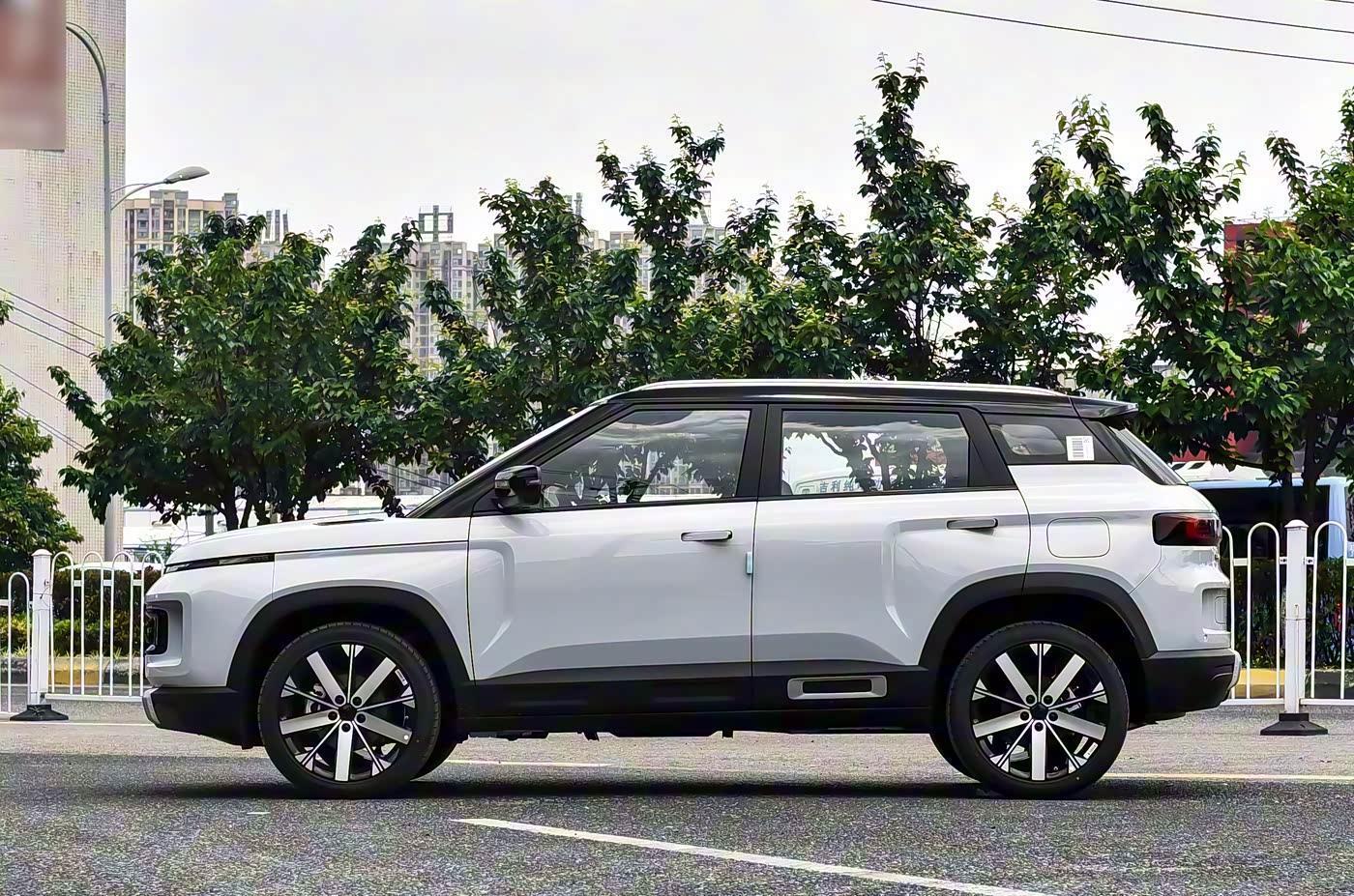 再来看车身侧面部分,车身侧面是吉利 ICON 的标志性所在,“方盒子” 轮廓勾勒出硬朗线条,巧克力系列的悬浮式车顶与隐藏式门把手,将风阻系数降低,兼具美感与能效。牛仔系列则通过宽体轮眉、潮酷型格大包围与 17 英寸越野轮毂的组合,强化轻越野姿态,部分版本还配备红色卡钳与 AT 越野胎,抓地力与视觉冲击力双重提升。车身尺寸方面,巧克力系列为 4350×1815×1620mm,牛仔系列略大至 4442×1860×1770mm,均保证了充裕的内部空间。