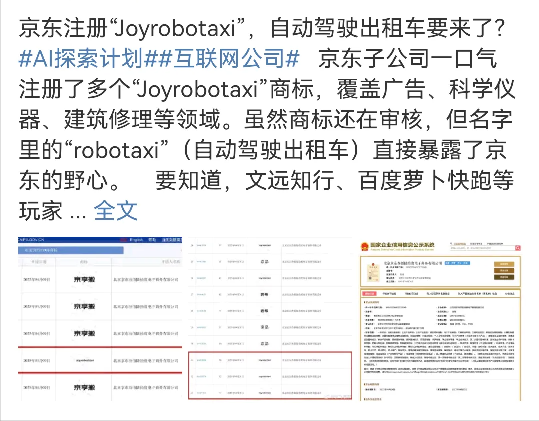 今年,京东还申请了“Joyrobotaxi”商标,计划用其旗下的L4级无人配送车经验入局自动驾驶出租车赛道。
