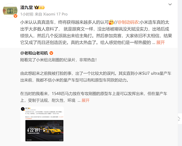 近日,小米汽车发布征战纽北纪录片完整版,有网友表示:小米造车真的太出乎大多数人意料了,就是跟爽文一样,没出场被嘲讽没天赋没实力,出场后成绩惊人,然后几个反派跳出来给主角打。