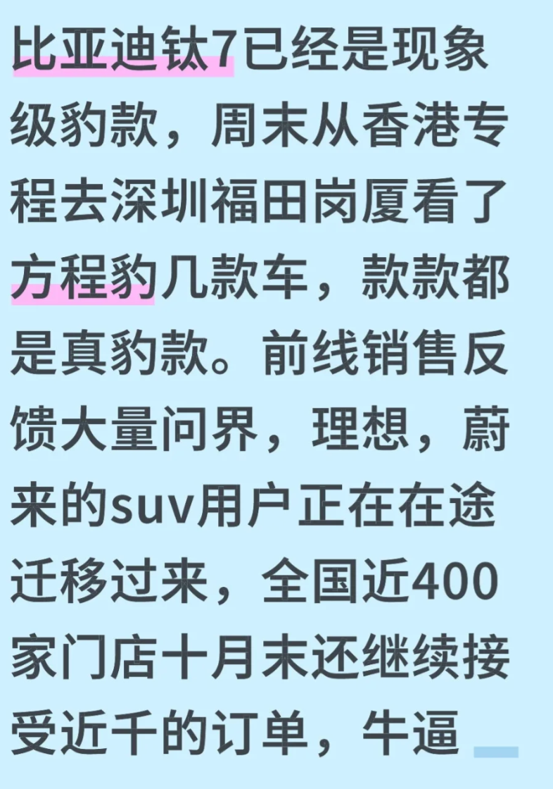 线下门店的“热闹场景”更直观体现其热度。深圳、上海、广州等一线城市的方程豹门店,周末常常出现“试驾要等、咨询要排队”的情况,有香港用户为了早日提车,特意跨城到深圳订车,“怕再等就要排到明年”;即便到了十月末,距离2025年结束仅剩两个月,全国400家门店仍能接到近千份新订单,这种“长尾热度”远超同期上市的其他新能源SUV。不过热度之下也有小插曲:有用户因销售坚持“1000元上牌费”而转购阿维塔,也有人呼吁“推出七座版,第三排能完全收纳”,这些反馈也成为钛7后续优化的方向。