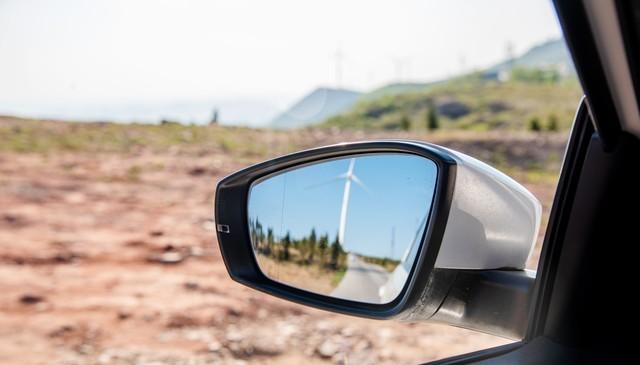 再看左后视镜,刚提车那会我还以为是镜子刮花了,后来才知道,那条线是好东西。平时变道、转弯,光靠镜子本身总有看不到的地方,这条线能把视野拉宽不少,后面跟的车离多远、在哪个位置,都能看得更清楚,跑高速的时候尤其管用,能少很多盲区风险。