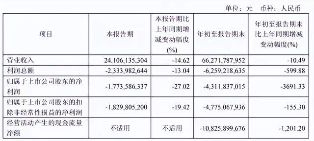 从核心财务数据看,三季度集团合并营业总收入243.18亿元,环比增长6.98%,同比下滑14.62%;归属于上市公司股东的净亏损17.74亿元,环比收窄,只是较去年同期扩大3.77亿元。