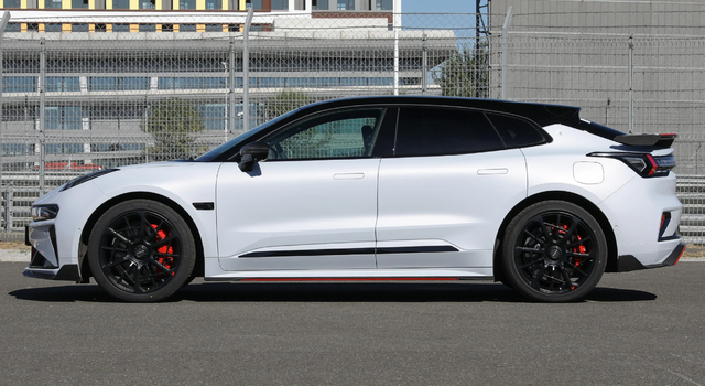 极氪001 FR版在外观方面,延续了普通版车型的大体轮廓,增加了运动风格的改装,标志性的分体式大灯也是得到保留,辨识度也是比较高,中网两侧为大灯远近光,FR版前包围还提供橙色涂装,并且提供碳纤维前唇,运动感还是比较突出的。
