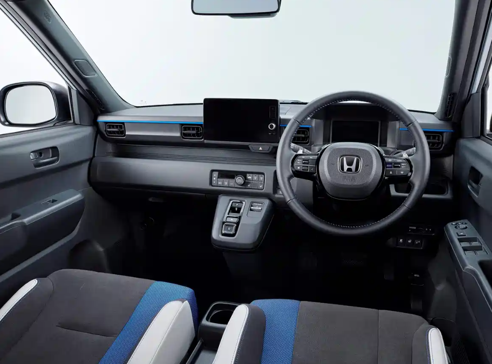 内饰则主打简约复古风,完美诠释日本小型车文化精髓。中控台布局清爽,悬浮式中控屏与物理按键搭配,兼顾科技感与操作便利性。蓝色装饰线条的点缀,既凸显其电动身份,又为复古基调注入现代活力,没有多余复杂元素,却在细节中传递出实用主义美学。