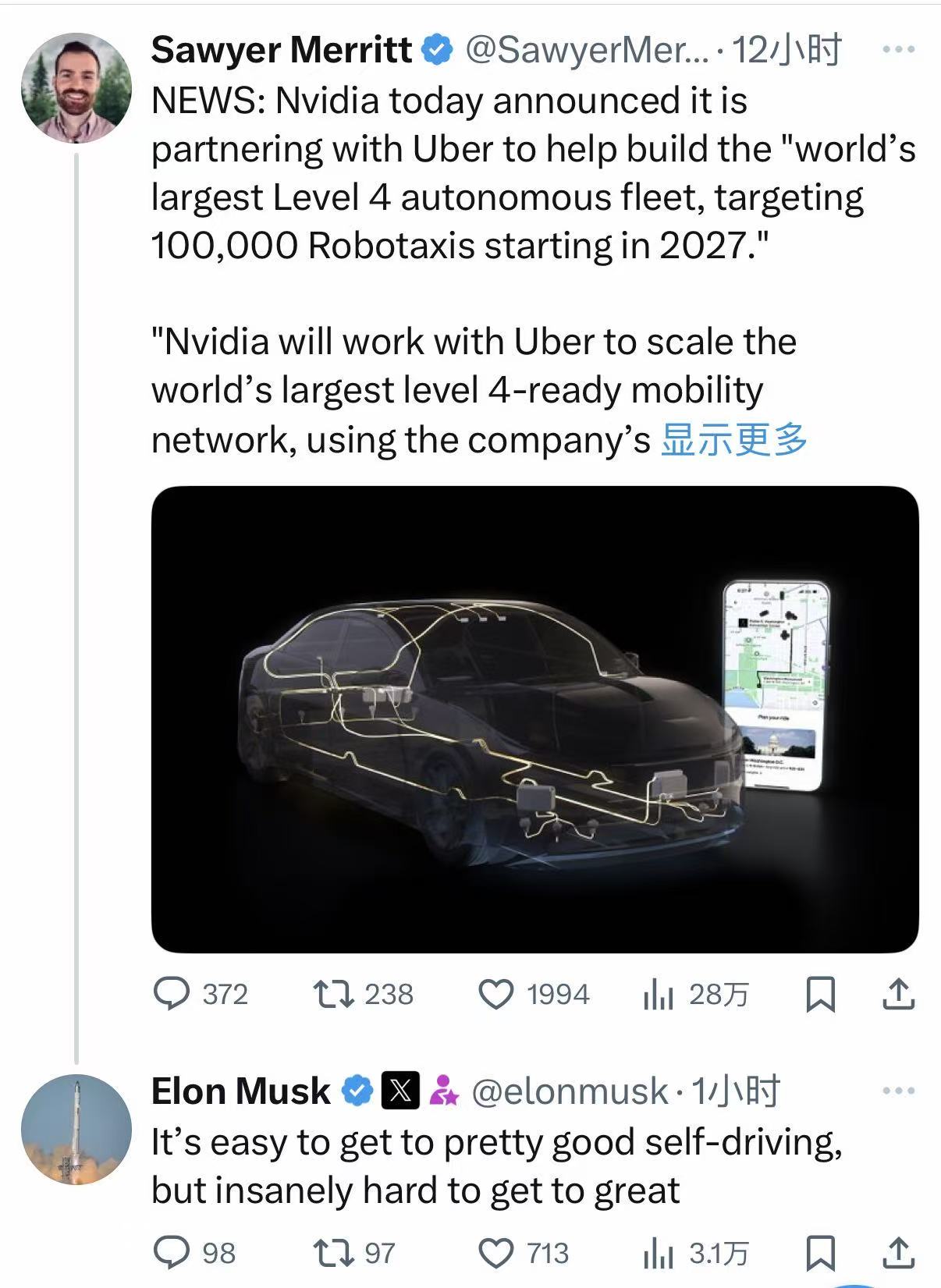 特斯拉首席执行官埃隆·马斯克近日在社交平台转发了一则关于自动驾驶领域的合作动态,并针对自动驾驶技术发展水平发表了个人见解。他指出,实现自动驾驶的"基础可用性"相对容易,但若要达到"真正卓越"的驾驶表现,技术层面仍面临巨大挑战。