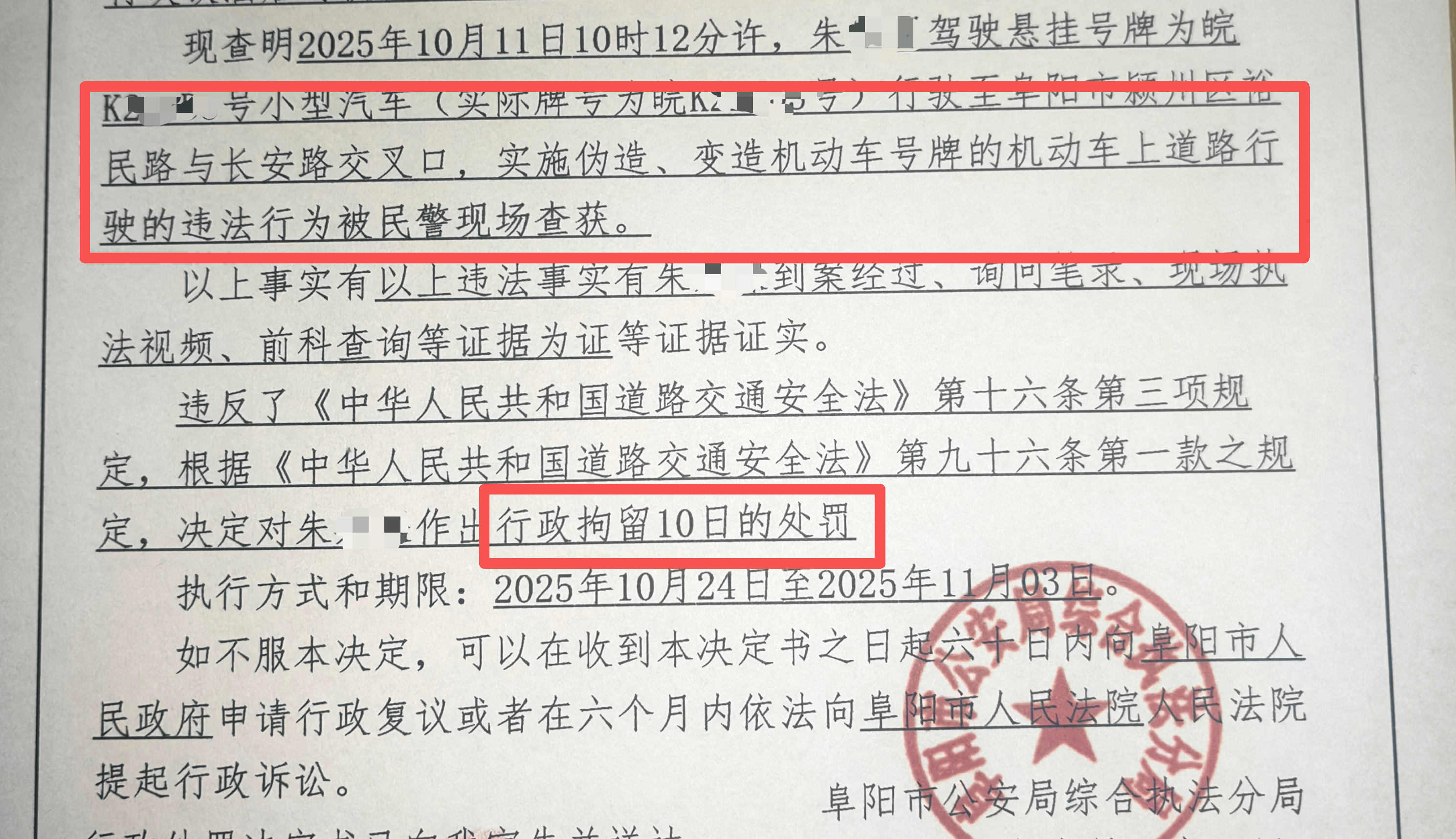 大皖新闻讯2025年10月11日10时许,阜阳市公安局交管支队经开大队接群众报警称,他的黑色轿车没开出去,手机却收到交通违法的提示信息,车辆疑似被套牌。“已依法对违法驾驶人朱某某处以罚款6200元,行政拘留10日的严肃处理。”10月30日,阜阳市交警部门有关人员告诉大皖新闻记者,朱某某将自己号牌中一个字母变更,就成了别人车牌。