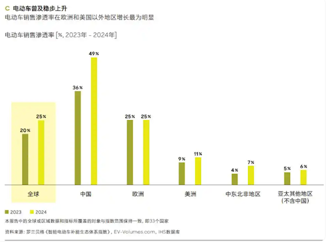从全球情况看,电动车整体的销售渗透率(包括纯电和插混)从2023年的20%上升至2024年的25%。中国继续领跑,其电动车销售渗透率从2023年的36%提升至2024年的49%,而相比之下,在其他众多成熟市场中,新能源汽车渗透率几乎没有增长。
