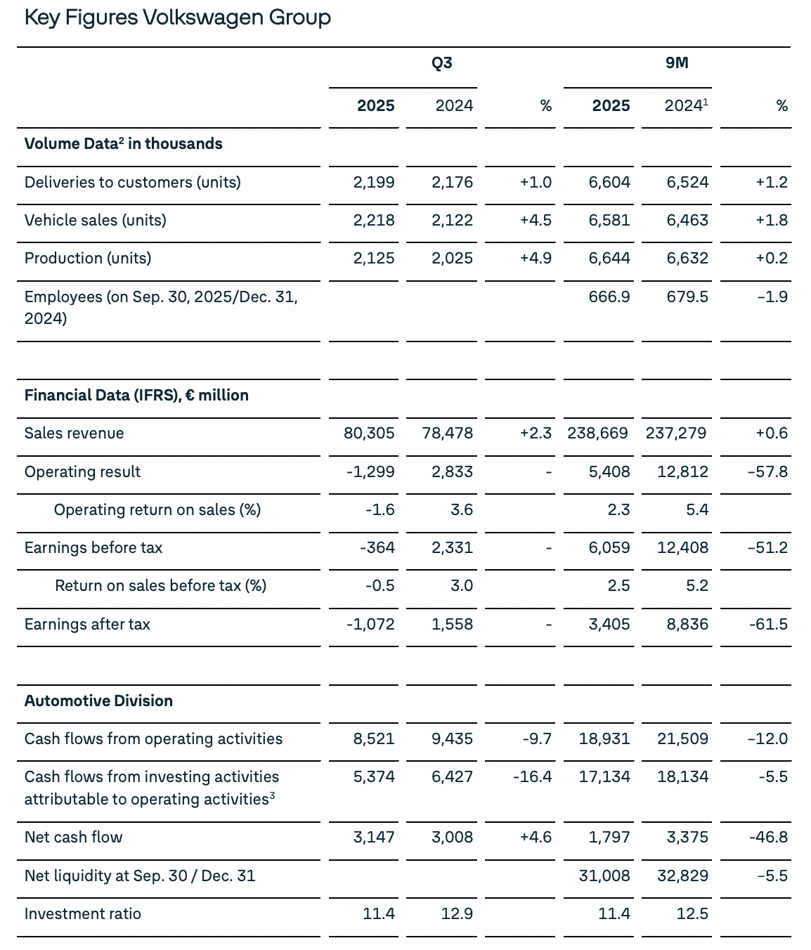 大众集团首席财务官阿诺·安特利茨(Arno Antlitz)表示,与上年同期相比,业绩明显走弱主要受低利润率的电动车产量增加,以及合计75亿欧元的额外负担影响,其中包括美国进口关税、旗下品牌保时捷的产品战略调整和相关商誉及企业价值减记等。若剔除相关费用,集团前三季度利润率为5.4%。
