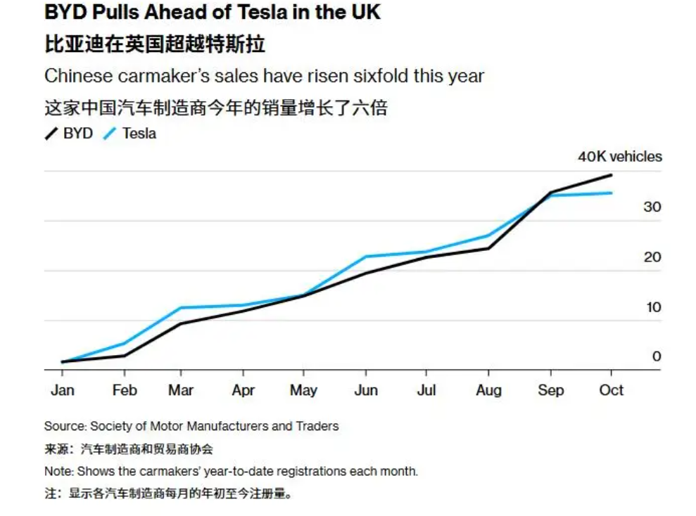 11 月 5 日消息,据彭博社报道,比亚迪在英国市场正逐渐领先特斯拉。英国汽车制造商和贸易商协会(SMMT)周三表示,10 月份,比亚迪在英国登记的新车数量几乎达到其竞争对手特斯拉的七倍。今年迄今,比亚迪在英国的销量飙升逾六倍,达到 39,103 辆,而特斯拉的销量则下滑了 4.5%,至 35,455 辆。