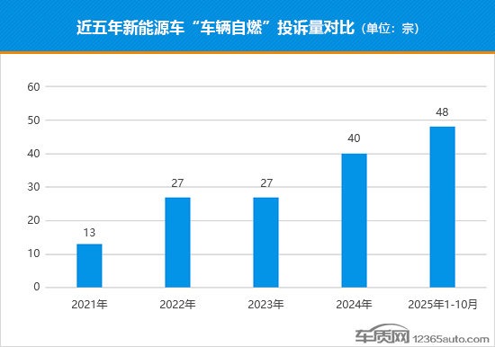 据车质网数据统计,近五年累计受理新能源汽车“车辆自燃”投诉155宗。具体来看,2021年的投诉量为13宗,2024年为40宗,涨幅超过2倍;而2025年前10月,投诉量便已超过了2024年全年投诉总量,达到48宗,其中不乏售价数十万元的高端新能源车型。