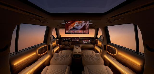 车内标配B&O音响与4D机械按摩座椅(强度为气动按摩7倍),瞬净新风系统每小时换气100次。首创野奢户外套装提供24小时热水,全车三零重力座椅、21.5英寸4K二排屏及12.3L冰箱等配置,满足家庭全场景出行需求。