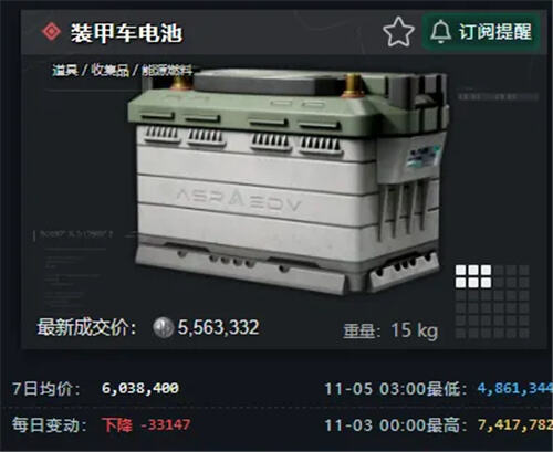 装甲车电池近期价格区间为486万-740万哈夫币,呈现明显波动特征。根据交易数据监测,每日凌晨时段(02:00-05:00)价格普遍低于日间均价30%左右,建议玩家在此时间段关注市场行情。