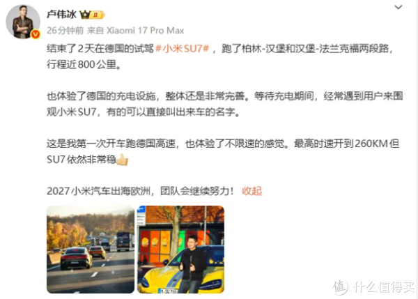 11月6日晚,小米集团合伙人、总裁卢伟冰微博发文称:结束了2天在德国的试驾小米SU7,跑了柏林-汉堡和汉堡-法兰克福两段路,行程近800公里。