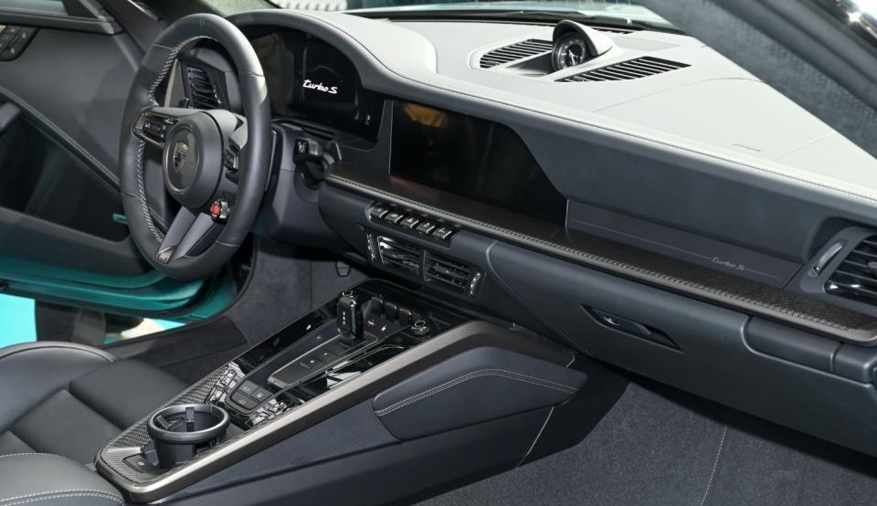内饰座舱延续911家族经典布局,但细节充斥 Turbo S 专属标识:车门面板、方向盘与中控台均采用 Turbonite 专属配色,Sport Chrono 计时码表与中控台缝线也同步呼应这一专属色调,营造强烈性能氛围。科技配置方面,10.9 英寸中控屏搭载最新 PCM 车机系统,支持无线 CarPlay 与 OTA 升级,配合全液晶仪表中的性能数据显示模块,可实时监控动力输出与底盘状态。