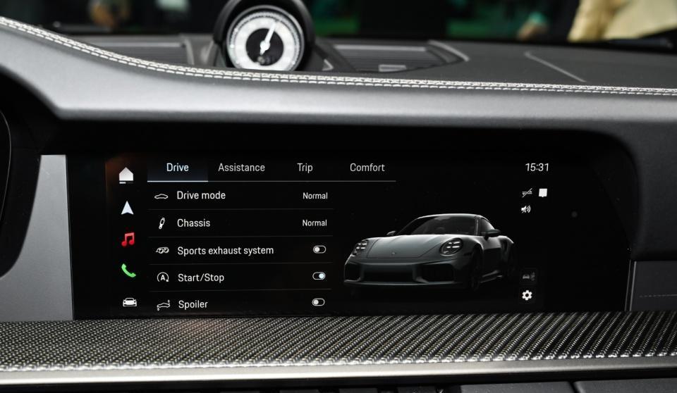 配置聚焦操控与安全,最新版本的保时捷动态底盘控制(PDCC)是核心亮点,采用电机驱动液压泵与独立液压蓄能器,响应速度较前代更精准,入弯时可大幅抑制侧倾,配合特别调校的 PASM 主动悬挂系统,将悬架降低 10mm,兼顾赛道支撑与日常滤震。安全与辅助配置同样全面:标配全速域 ACC、PCS 预碰撞安全系统,540° 全景影像让低速挪车更从容。