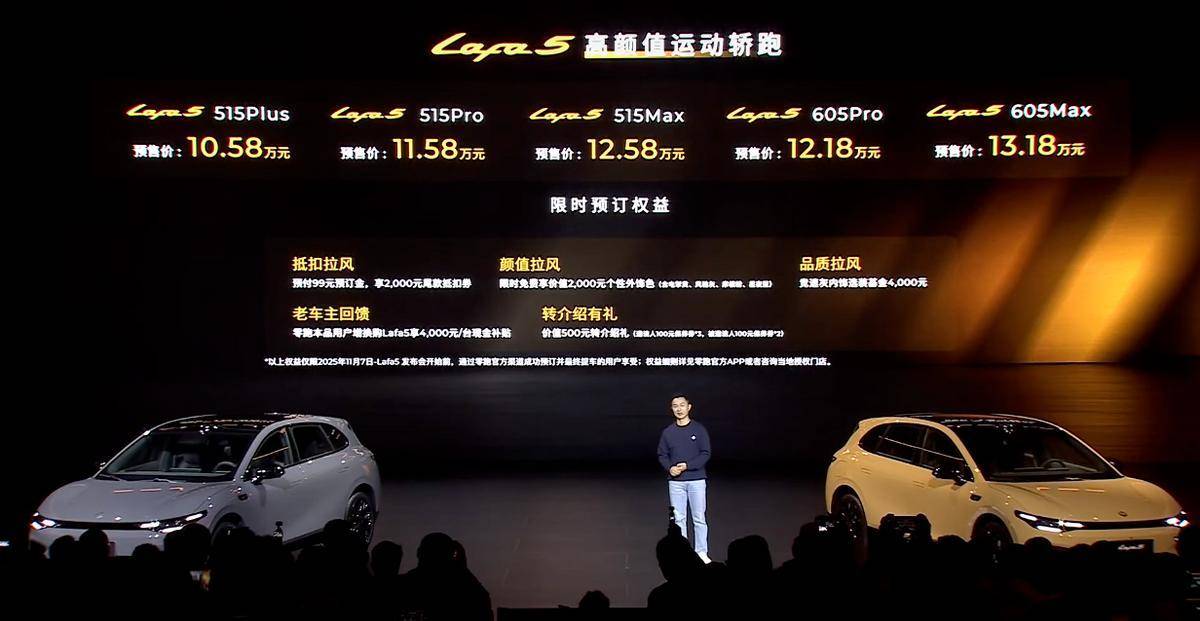继旗舰之作零跑D19发布之后,趁热打铁,零跑全新个性战略新品——Lafa5终于和消费者见面。就在今日(11月7日),零跑Lafa5开启预售,共推出5个车型版本,纯电续航有515km和605km,预售价格10.58-13.18万元,按照以往零跑的定价策略,大概率正式上市后还要便宜1万,预计入门版价格将在10万以内。据悉,新车预计将在11月28日正式上市。