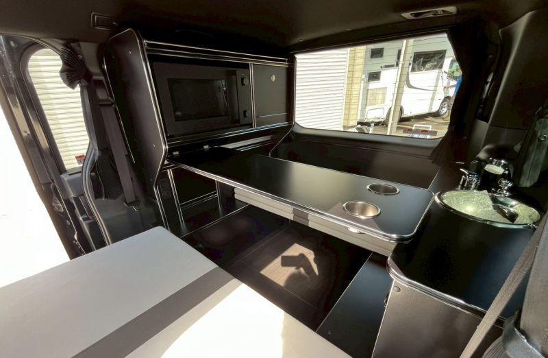 车内生活设施也有一些,座椅后部的空间两侧设置了橱柜,不锈钢台盆和抽拉式花洒,另一侧的柜子上有微波炉以及其他设备,小桌子也可以拿到户外,搭在车尾的轨道上,方便露营使用。