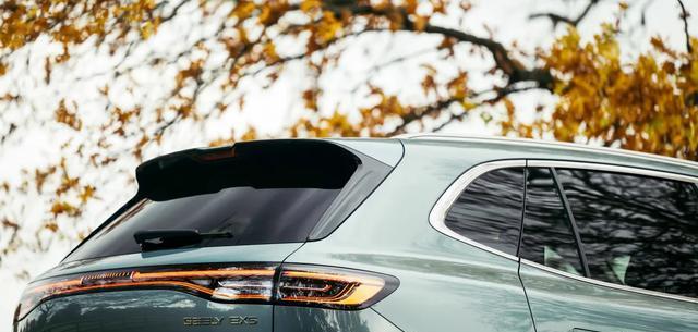 车尾部分,车顶扰流板,贯穿式尾灯,也都有着不错的辨识度,尾箱线条较为简洁,右下角有着醒目的吉利EX5标志,并没有其他任何车标,似乎也符合欧洲消费者的口味,后保险杠部分加入了银色护板,让整车的风格形成统一。