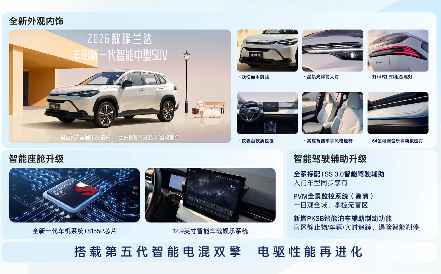 新车同样在智能化配置上有所升级,全系标配采用丰田全新一代12.9英寸智能车载娱乐系统(内建高通骁龙8155P座舱娱乐芯片)以及TSS 3.0智能驾驶辅助系统。