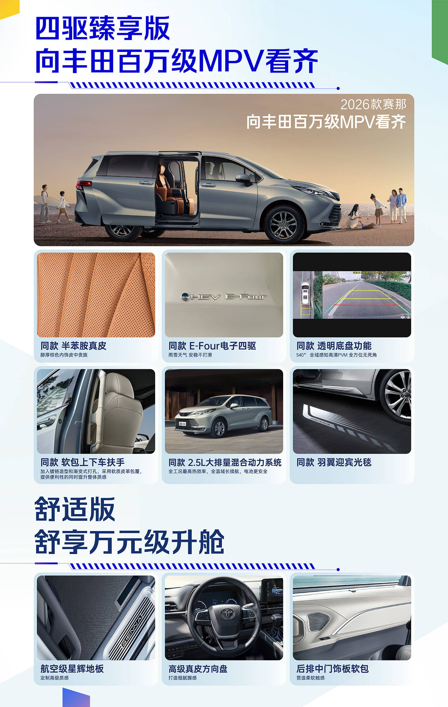 9月5日,新款赛那已上市,新车取消原入门舒适版车型,顶配及次顶配车款价格下调,整体价格区间为32.48-39.38万元。同时此次新增四驱臻享版,豪华舒适以及智能配置上有较大提升。