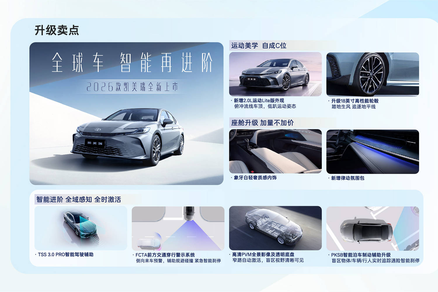 2026款丰田凯美瑞也于7月29日正式上市,价格区间为17.18-25.98万元。新增的2.0L 运动Lite版售价为19.18万元,采用TSS3.0 PRO驾驶辅助系统,新增律动氛围包,包括64色氛围灯、智能香薰、象牙白内饰等等。
