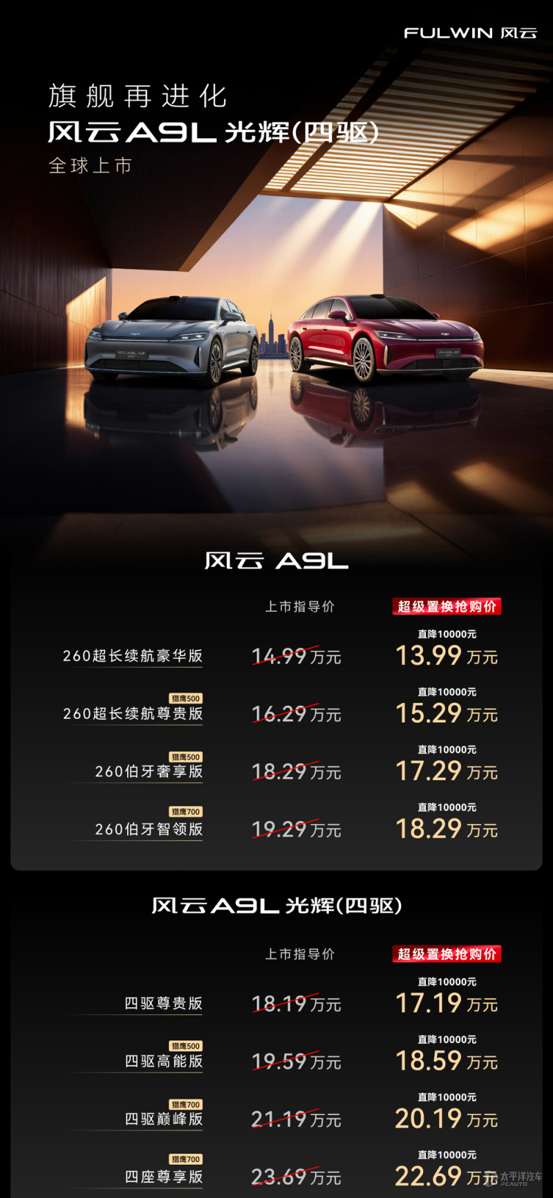 【太平洋汽车 新车频道】11月15日,奇瑞风云A9L光辉上市。4款车型的售价18.19-23.89万元,超级置换抢购价17.19-22.69万元。另外风云A9L(询底价|查参配)上新260伯牙智领版(猎鹰700),超级置换抢购价为18.29万元。