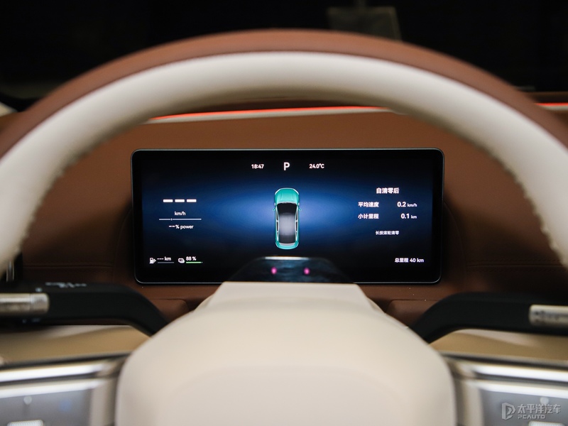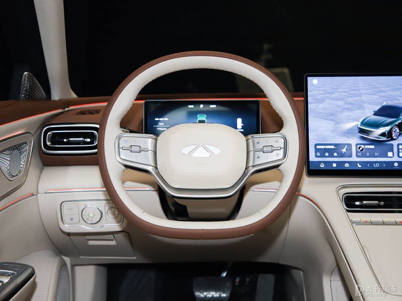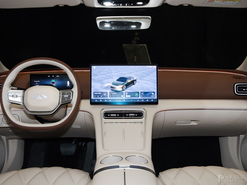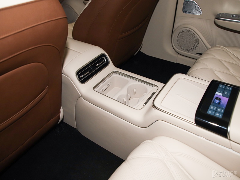 内饰部分,新车搭载全液晶仪表盘,搭配双色双辐式多功能方向盘,中控台中央配备悬浮式中控多媒体触摸屏。通道区域布局清晰,集成了空调出风口、物理功能按键、无线充电面板及双独立水杯架。四座版车型采用棕 / 米白双色配色,后排乘客专属座椅控制面板支持通风、加热、按摩功能,中间原靠背位置嵌入冷暖箱,强化车辆的实用属性与乘坐舒适性。