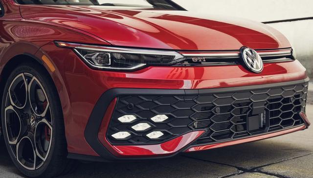 2026款高尔夫GTI在外观上并未进行大刀阔斧的改变,基本延续了第八代车型的设计。前脸上方采用窄幅式进气格栅,配以贯穿式红色装饰条,同时GTI的标识也提升了辨识度,车头下方则为大尺寸的蜂窝格栅,锐利的边角造型也增强了视觉冲击力。车侧轮廓依然是经典的两厢车造型,线条干练简洁,五辐花瓣造型的轮毂是GTI的经典元素,内部醒目的红色卡钳隐约可见,展现着整体的性能调性。车尾部分采用了熏黑处理的尾灯组,车顶配有大尺寸镂空扰流板,与下方双边单出的排气相呼应,共同强化了整车的运动属性。