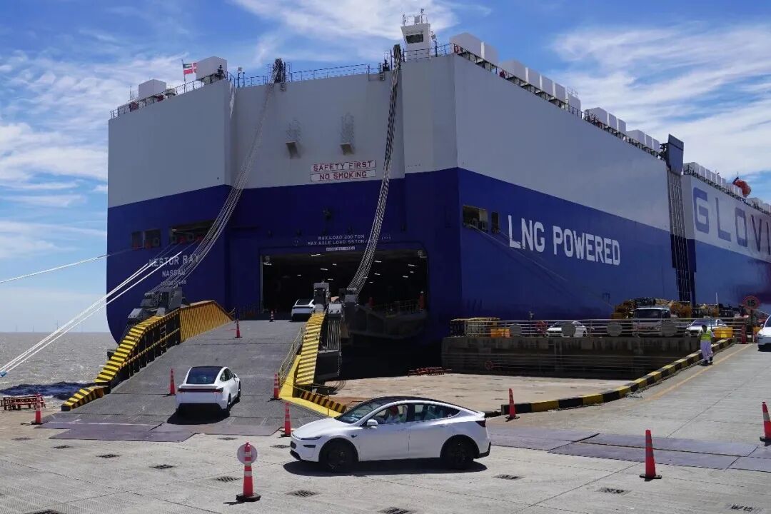 2025年7月2日,在上海自贸试验区临港新片区南港码头,一批新能源汽车驶向一艘滚装货轮/新华社记者杨有宗 摄