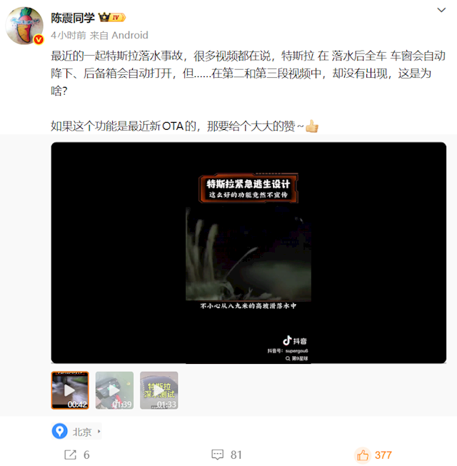 在得到客服的答复后,陈震表示,这就有点尴尬了,那么,在最开始的视频中,特斯拉落水后会自动落窗和打开后备箱盖的说法,是从哪来的呢?