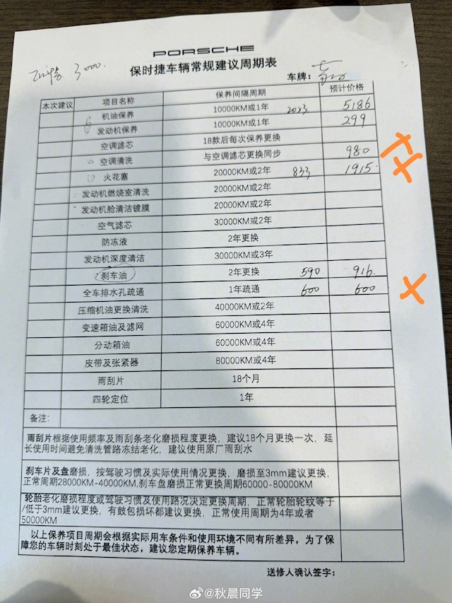 据悉,博主“秋晨同学”买的保时捷718两年半开了8000公里,今日去保养,4S给罗列了一些建议项目,累计收费近9896元,光是机油一项就要5100多。