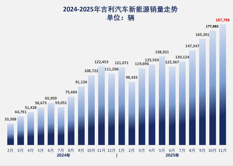 吉利 11 月的销量爆发,核心驱动力来自新能源板块的全面突围,单月销量冲到近 19 万辆,即将迈向新能源市场的下一个销量级别。