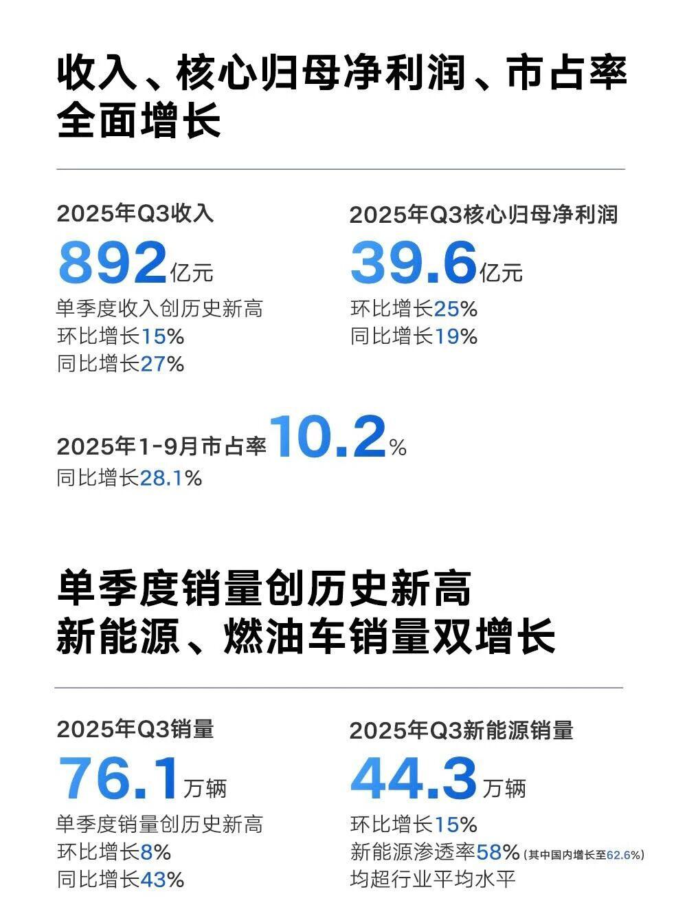 但吉利有点不一样,跑出了销量和经营质量同步提升的节奏。根据其 11 月份发布的第三季度财报,吉利单季营业收入 892 亿元,同比增长 27%,单季收入创历史新高;核心归母净利润 39.6 亿元,同比增长 19%。