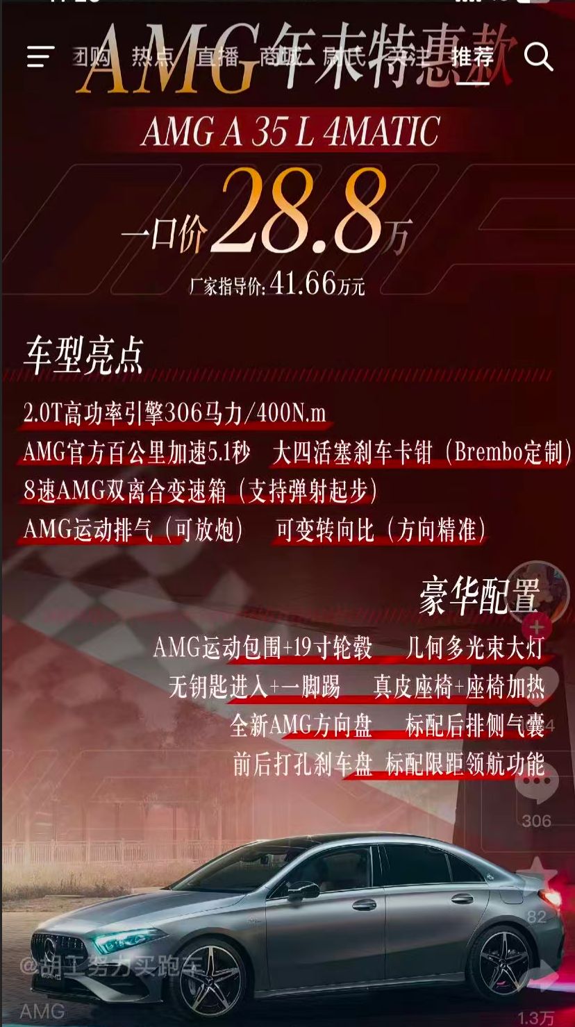 A35L其实一直也有很大的折扣,只是前两年奔驰大搞全系列amg化,希望拉高利润率,所以AMG系列的真实折扣一直没有公开说。最近不少门店开始搞年底促销,把底价都透出来了。