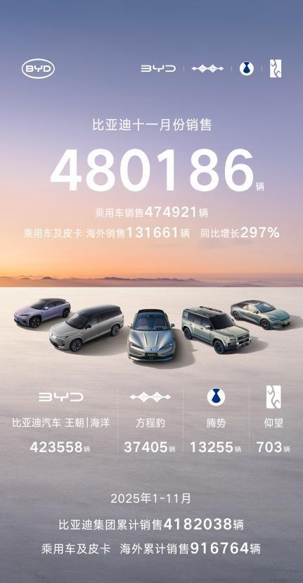 从整体数据来看,比亚迪11月全集团销量达到480186辆,其中乘用车贡献了474921辆,再次刷新了2025年以来的单月销量高点。这不仅意味着比亚迪在国内市场保持了强劲的势头,也反映出其在产品布局与市场响应上的持续竞争力。值得关注的是,今年1月至11月,比亚迪累计销量已突破418万辆,同比增长11.3%,这一数字也基本锁定了比亚迪作为2025年度中国汽车市场销量冠军的地位。