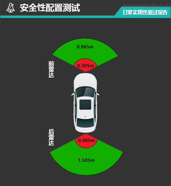 前雷达最远可以在0.965m处感应到前方物体,雷达功率表现一般;最近端感应距离为0.305m,表现同样未达到同级别车型平均水平。