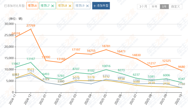 资本市场的冷淡反应,与理想汽车当下的经营压力形成呼应。自今年6月起,理想汽车连续6个月销量同比下滑,64万辆年销目标完成率不足六成。当前,理想汽车正处在增程与纯电双线发展的关键阶段,但两大板块均面临不同程度的市场压力,销量已连续多月在“蔚小理”中排末位。