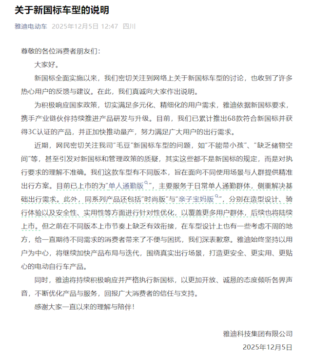 今日,雅迪电动车官微发布关于新国标车型的说明,向消费者致歉。