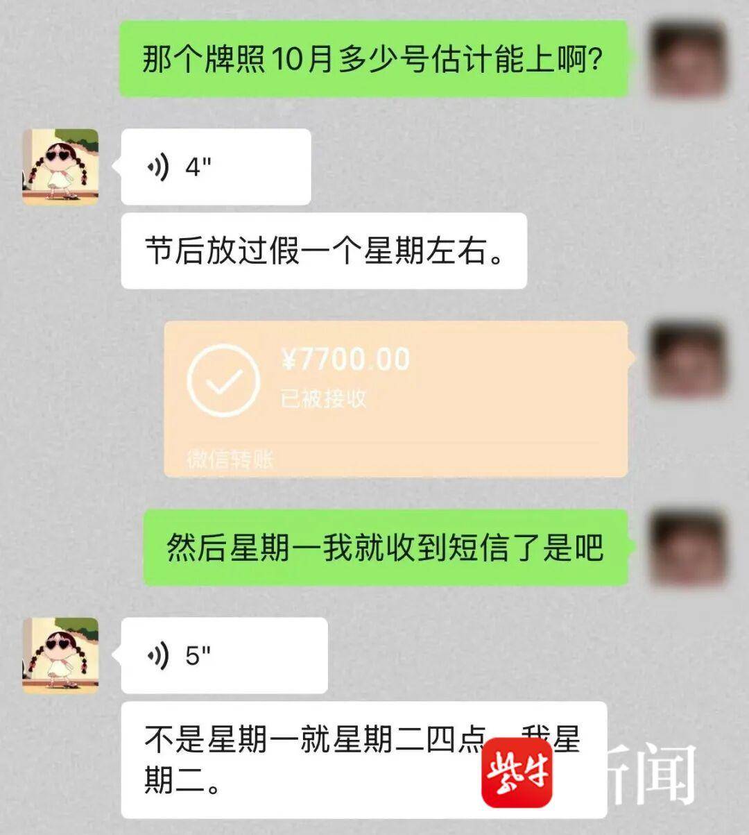 王先生主动与对方联系提出向对方购买苏JJ9999车牌号,最终双方协商价格20余万元。王先生微信支付7700元作定金约定车牌号下来后将剩余尾款付清。