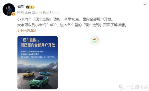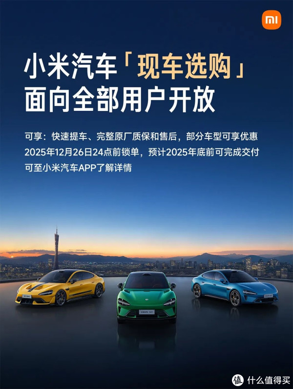 小米这波操作挺突然,12月1日分阶段开放现车选购,3号就全面面向所有用户,打开小米汽车APP就能挑。现车看着挺香:涵盖用户退订的全新车、展厅展车,还有轻微运损修复车,都没登记上牌,官方说经过严格质检修复,还能享受完整原厂质保。而且12月26日前锁单,有机会年底前提车,要是因为小米原因延迟到2026年交付,还能拿跨年购置税补贴,部分车型还有额外折扣,对于急着用车的人来说,诱惑力确实不小。