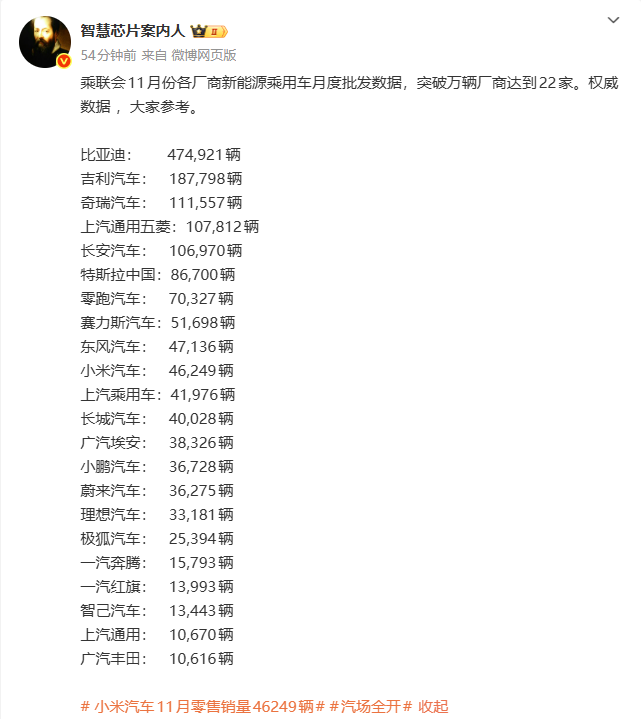 【CNMO科技消息】12月9日,乘联会11月份各厂商新能源乘用车月度批发数据出炉。其中,突破万辆厂商达到22家,更有5家中国品牌车企月销量超过了10万辆大关。