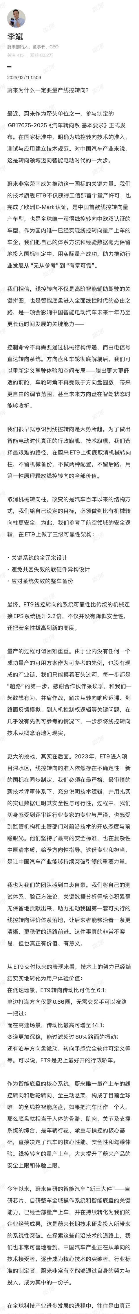 线控转向并非全新概念,但因极高的安全冗余要求,其量产一直是业界的工程难题。那么,蔚来为何执着于此?