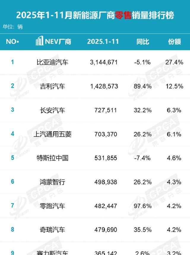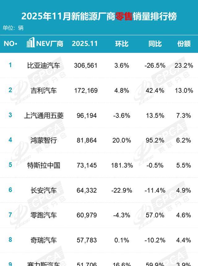 进入今年下半年,国内新能源汽车的销量进入放慢、平缓阶段,近日乘联分会发布了2025年11月汽车厂商销量排名快报,其中包括11月份新能源厂商零售销量排行榜,仅发布两款车的小米,挤进前十名次。